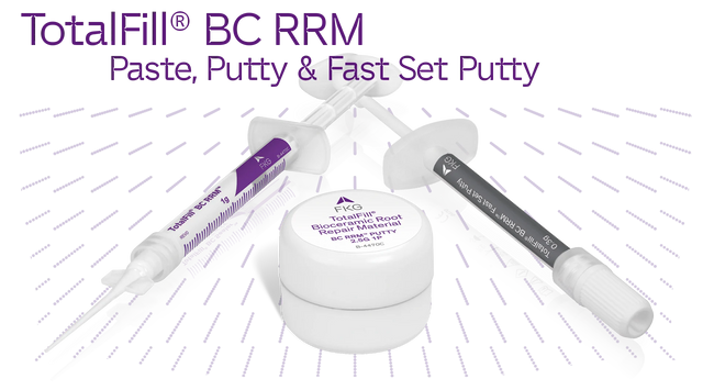 The FKG TotalFill® BC RRM (Root Repair Material) is a bioactive bioceramic material specifically designed for root and endodontic repairs. With outstanding sealing properties, excellent biocompatibility, and a ready-to-use formulation, it supports fast, predictable healing in a wide range of endodontic procedures.