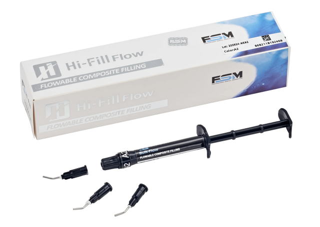 FSM Hi-Fill Flow is a light-cured flowable composite resin specially formulated for precision, adaptability, and long-lasting aesthetics. With its ideal viscosity and high filler content, it ensures excellent flow, superior strength, and a smooth finish for both anterior and posterior restorations.