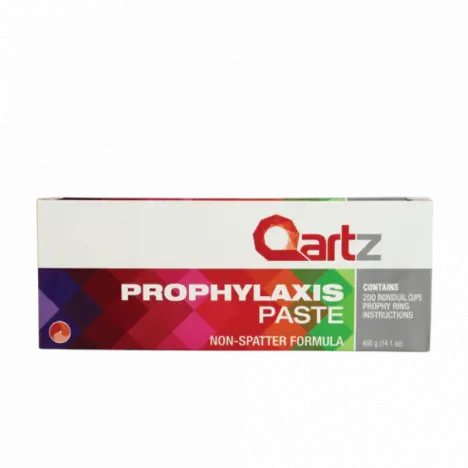 Qartz is a prophylaxis paste with a unique blend of cleaning and polishing agents. This blend maximizes stain removal while minimizing enamel loss. It helps maintain an effective fluoride level, strengthening tooth enamel and preventing dental caries. Our unique heavy viscosity makes our paste “splatter free”. It rinses easily and consistently.