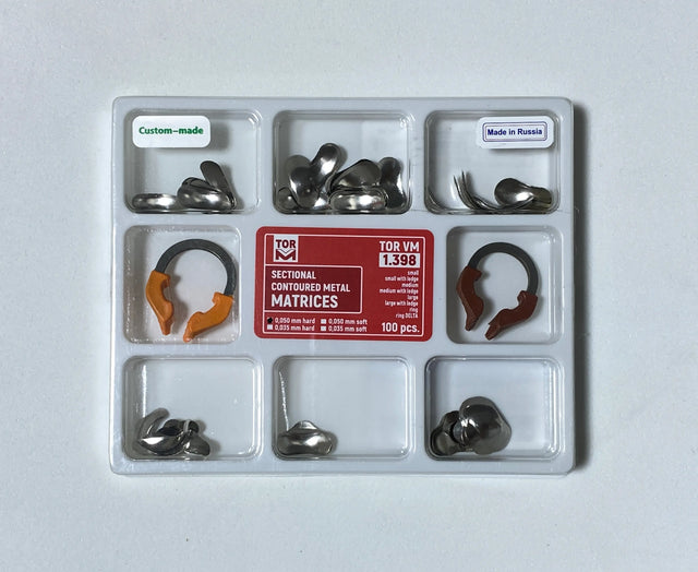 TOR VM Sectional Matrix System with NiTi Ring is a high-performance restorative system designed to achieve precise and tight interproximal contacts in Class II composite restorations. It features ultra-thin sectional matrices combined with a nickel-titanium (NiTi) ring, ensuring optimal tooth separation, excellent contour, and long-lasting elasticity for multiple uses.