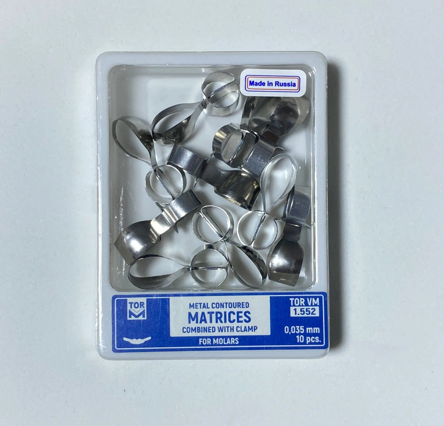 TOR VM Metal Contoured Matrix is a high-quality, pre-contoured stainless steel matrix designed for precise adaptation to tooth anatomy during Class II composite restorations. Its anatomical shape ensures tight contact points, smooth surface finishing, and an excellent marginal seal — minimizing finishing time and improving restoration accuracy.