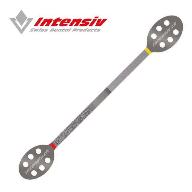 A unique, diamond-coated metal strip with grips for the final polishing of proximal surfaces
