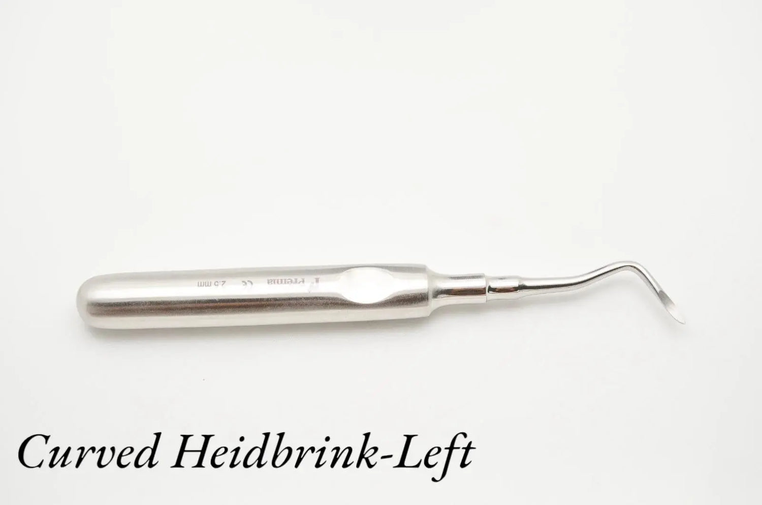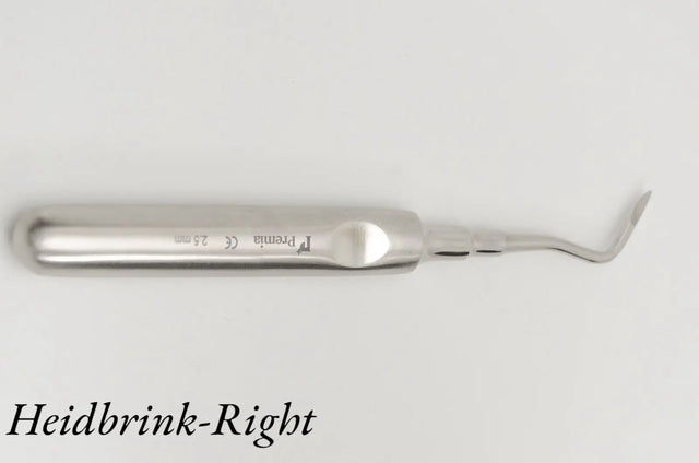 The Premia Curved Heidbrink Elevators are precision dental instruments designed for atraumatic tooth extraction in challenging positions. This set includes both Right and Left curved elevators, allowing optimal access and leverage for loosening teeth while preserving surrounding bone and soft tissue. Crafted from high-quality stainless steel, these elevators provide durability, precision, and professional-grade performance.